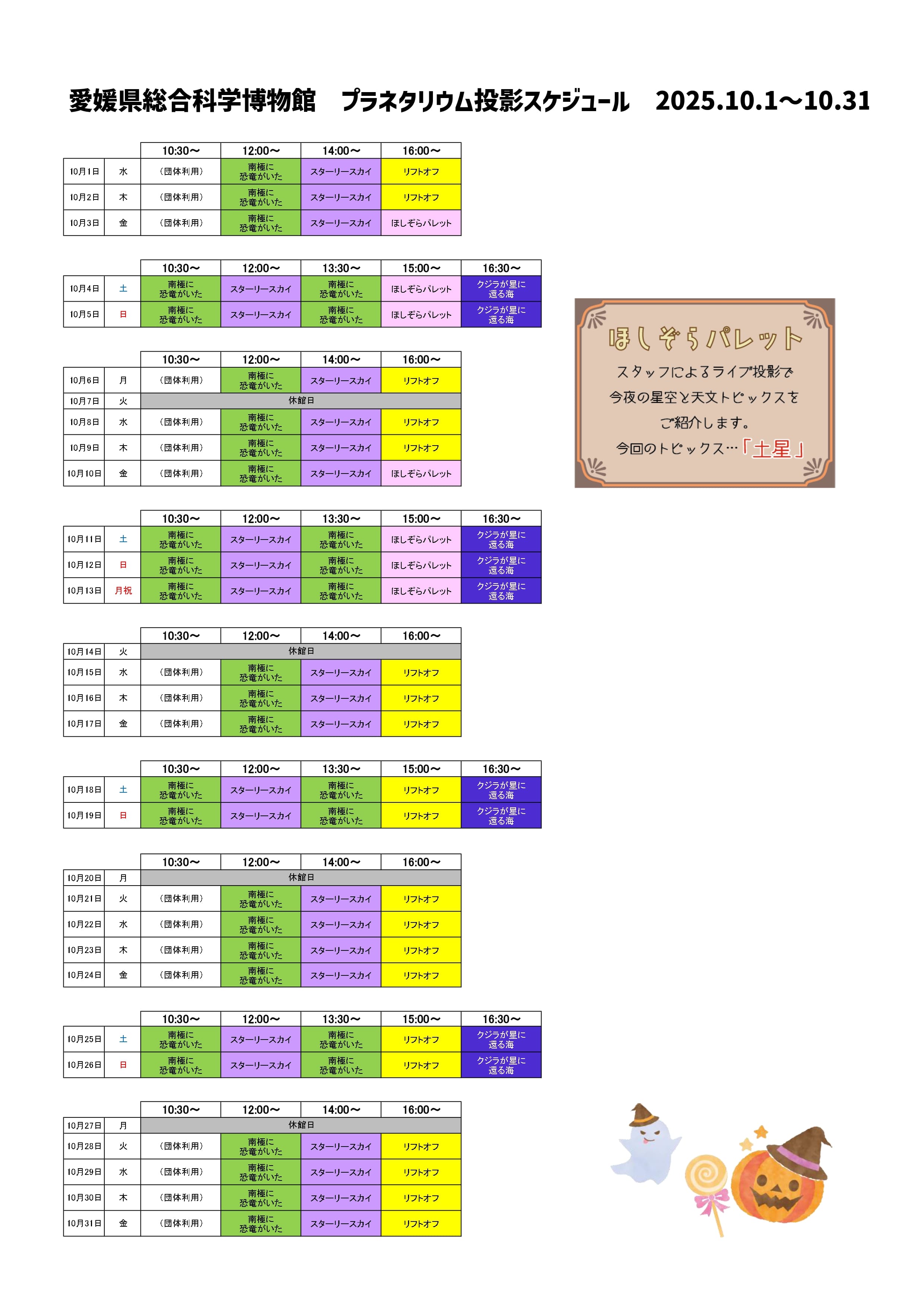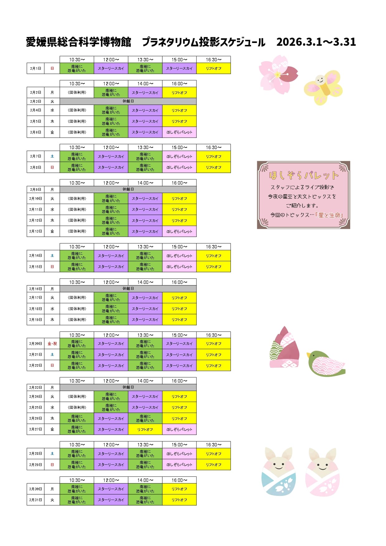 プラネタリウムの休館日は当館の休館日に準じます。 開館日カレンダーはこちら