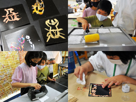 手すきではがきサイズの和紙を作ります。黒い台紙には模様やメッセージをギルディングで装飾し、ギルディングカードを作ります。