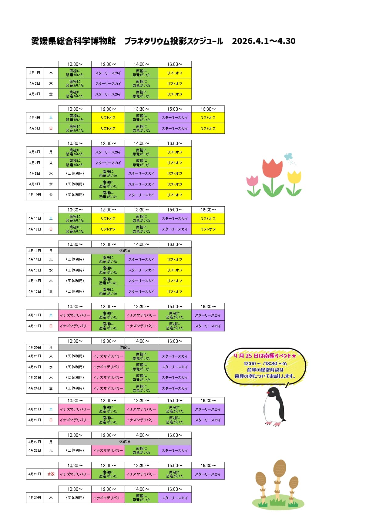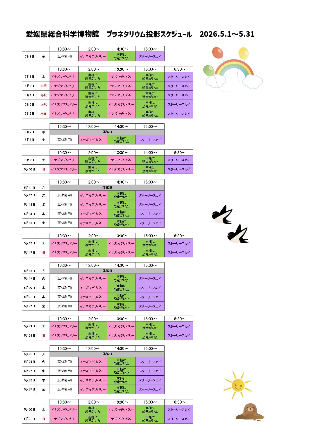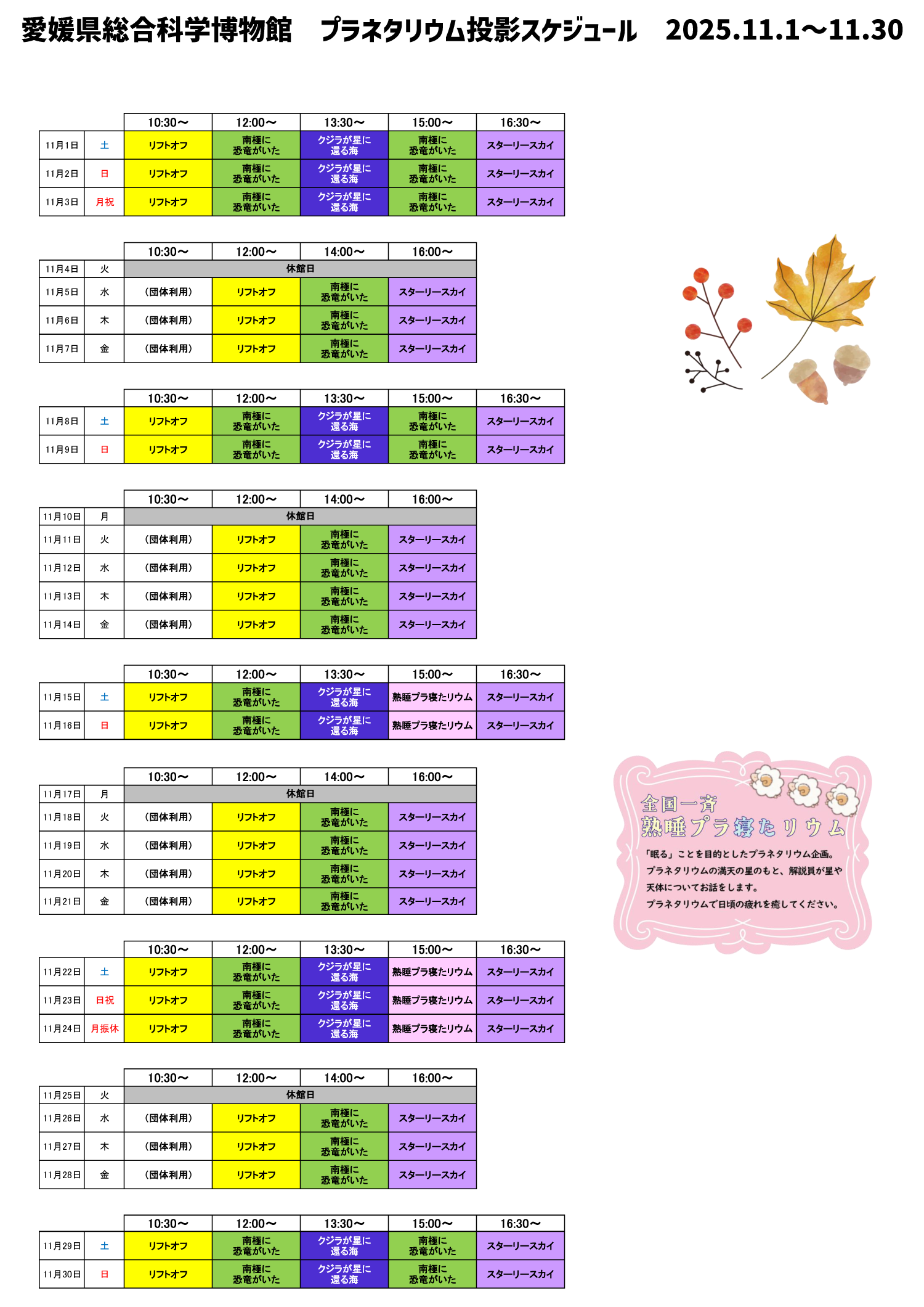 プラネタリウムの休館日は当館の休館日に準じます。 開館日カレンダーはこちら