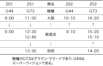その頃、新居浜‐大阪間を結ぶ航空路が存在しました。昭和34年から40年のことで、新居浜市内にあった多喜浜塩田が操業を終了するのと同時に始まりました。12人乗りの小さな飛行機が、1日に多いときで2往復、営業所員もわずか6人というローカル線でした。その6人で、券の販売、旅客や荷物の受付、飛行機との通信、旅客を船で飛行機へ輸送するなど多くの業務をこなしていました。新居浜には飛行場がありませんので、水陸両用飛行機が、新居浜沖に位置する大島と黒島の間の海に着水していました。主に使われていた飛行機は、アメリカのグラマン社製水陸両用飛行艇マラードでした。マラードとは、マガモのことです。マラードの機首は、上部が水平で下部がぷっくりふくれていてマガモのくちばしのようにも見えます。マラードは、日本で5機使用されましたが、全て新居浜への航空路を運航していた日東航空が輸入しました。巡航速度は、260km/hと現在のプロペラ旅客機の半分程度であり、新幹線のぞみ号の最高速度300km/hよりも遅い速度です。それでも新居浜‐大阪間の所要時間は1時間ちょうどで、現在の旅客機が松山‐大阪間を飛ぶ55分(上り)または50分(下り)とほとんど同じです。 |